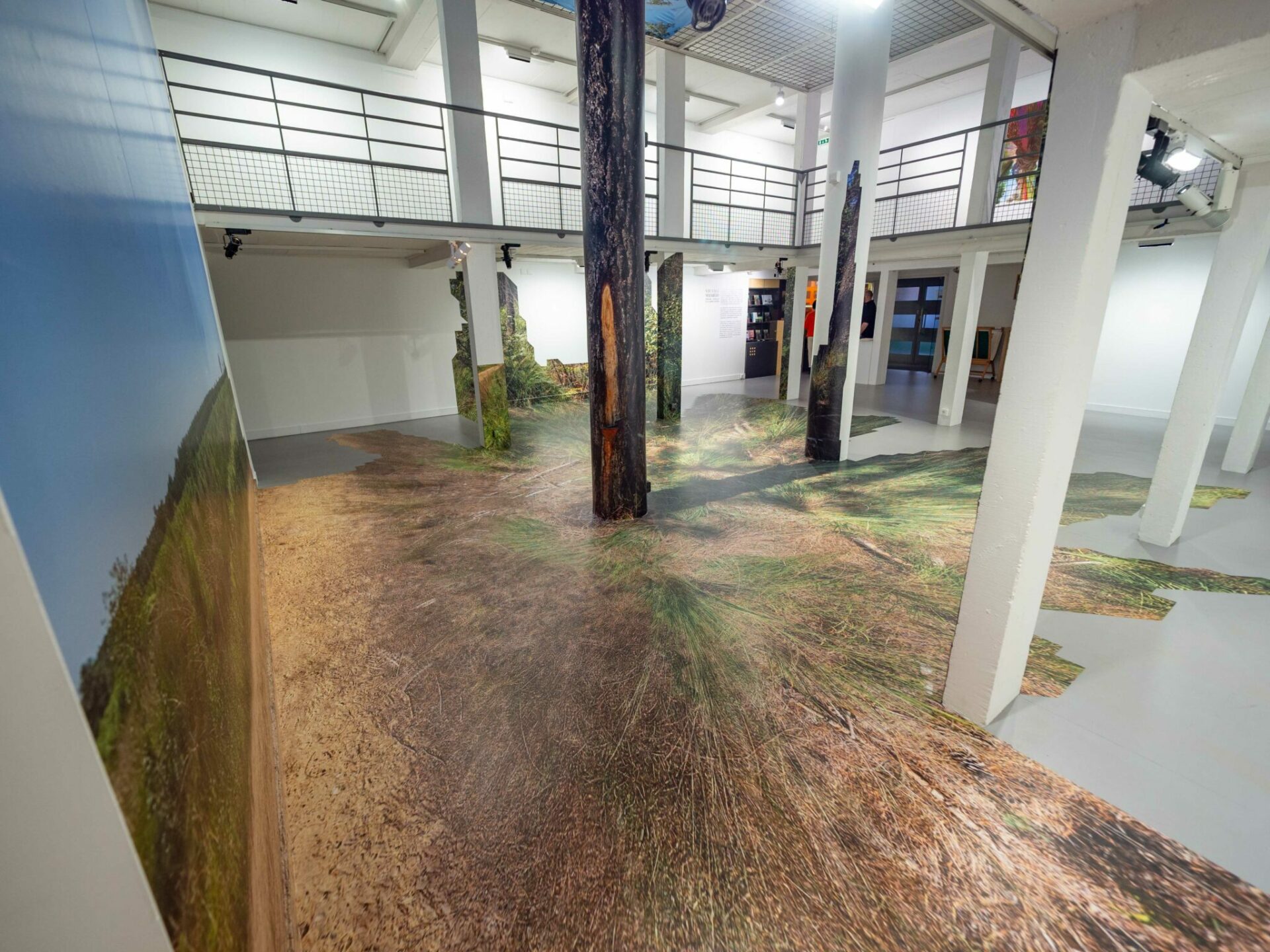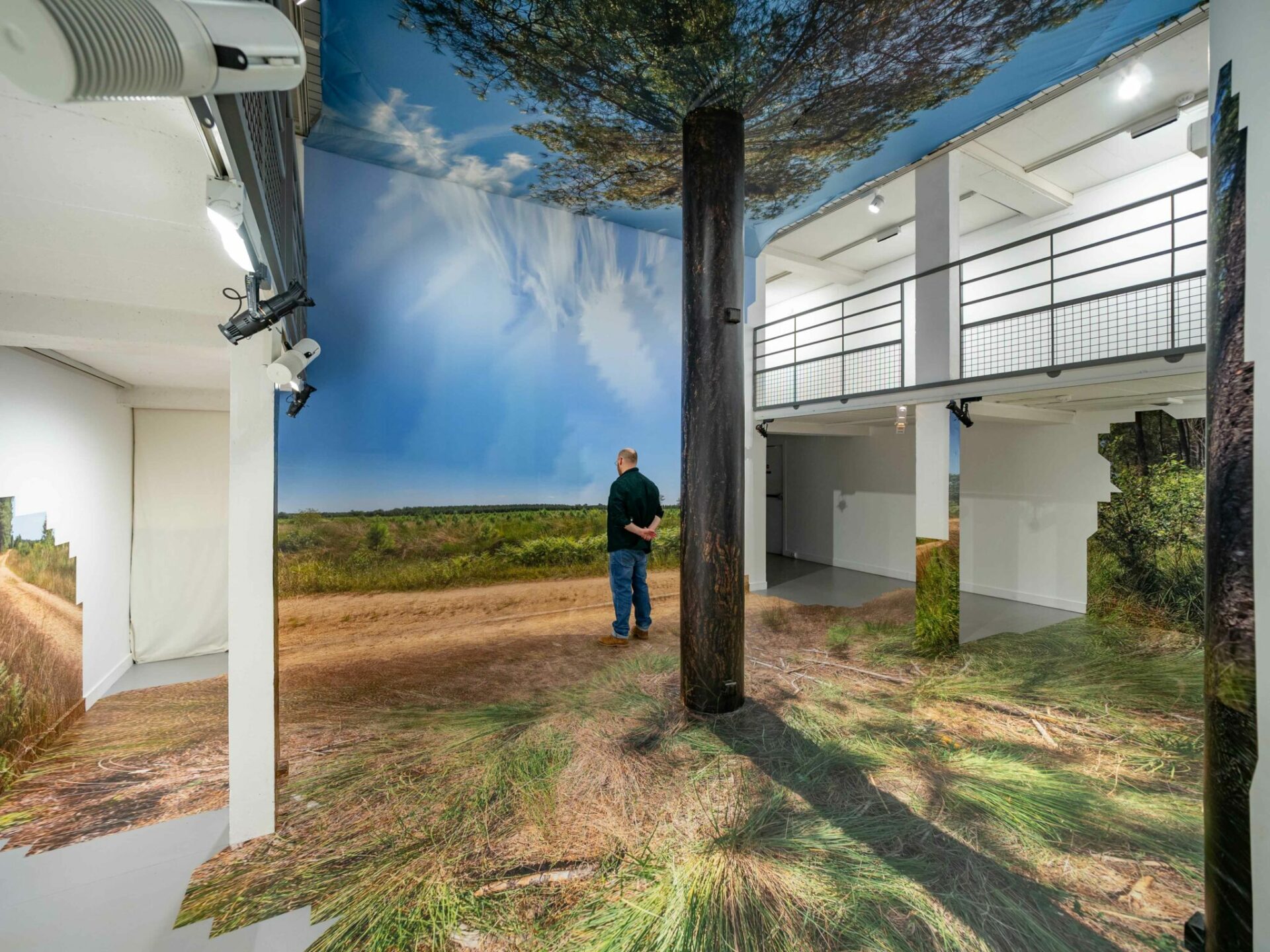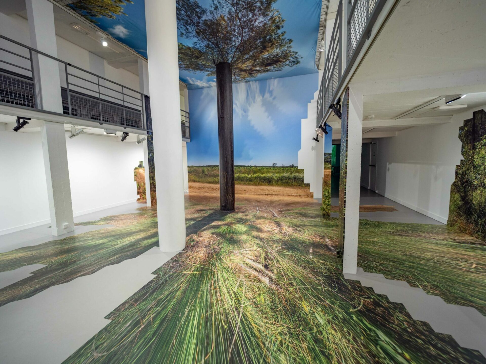 À la manière de Félix Arnaudin, les artistes ont arpenté ce secteur à la recherche des rares espaces horizontaux qui apparaissent de manière temporaire juste après la coupe rase d’une parcelle. Après une dizaine de jours, combinant marches et photographies, les artistes ont sélectionné un fragment d’espace qu’ils ont photographié sous toutes ses coutures. Les images ainsi obtenues ont été transposées et appliquées par projection à même les murs de la galerie, provoquant une intrication d’espaces discordants. Seul le pilier central s’ajuste parfaitement au tronc de l’arbre, faisant office de point de convergence. Ainsi, plus on s’en éloigne, plus l’image perd en définition, glissant au fur et à mesure du photoréalisme vers un rendu vaporeux tendant à une forme d’abstraction.