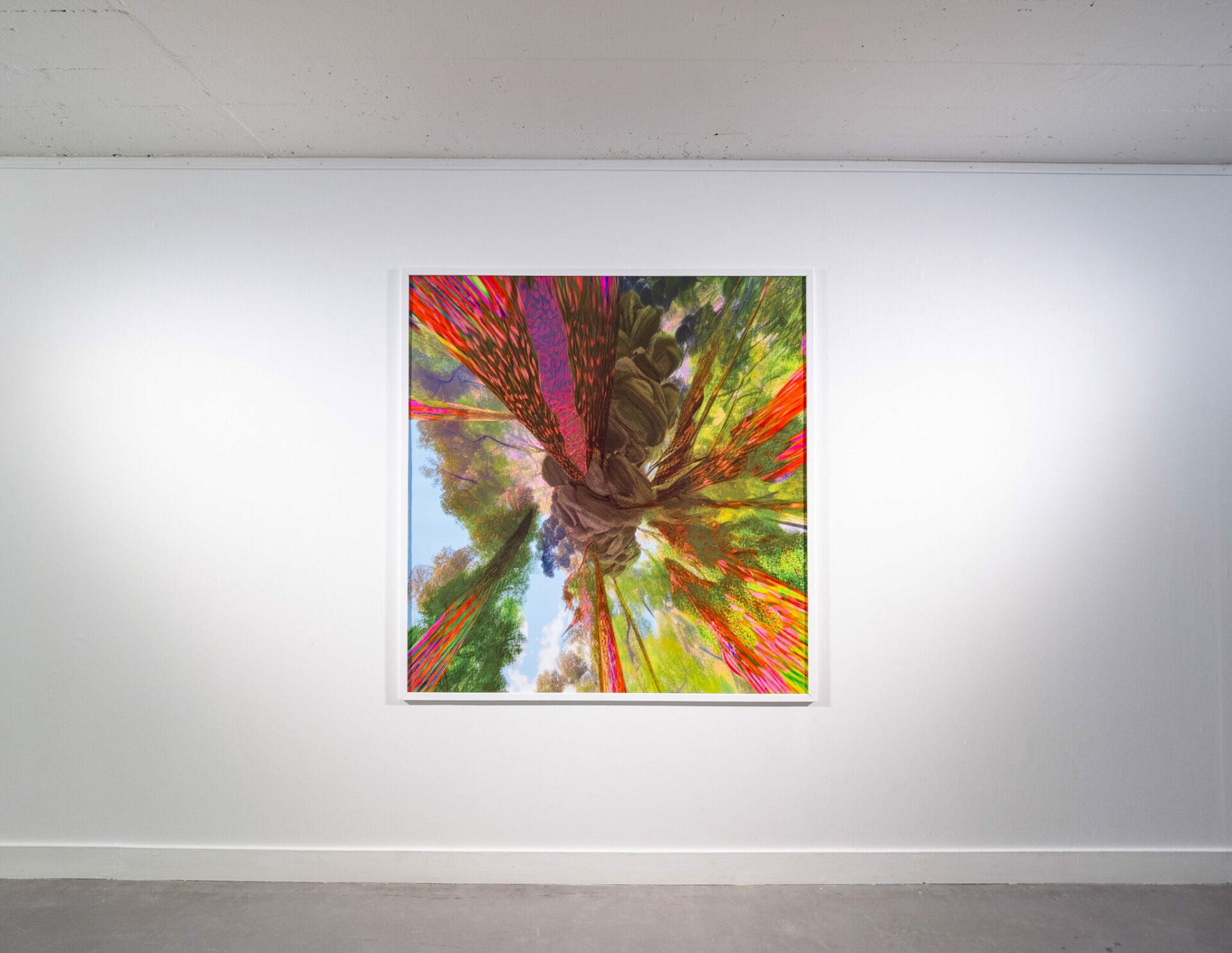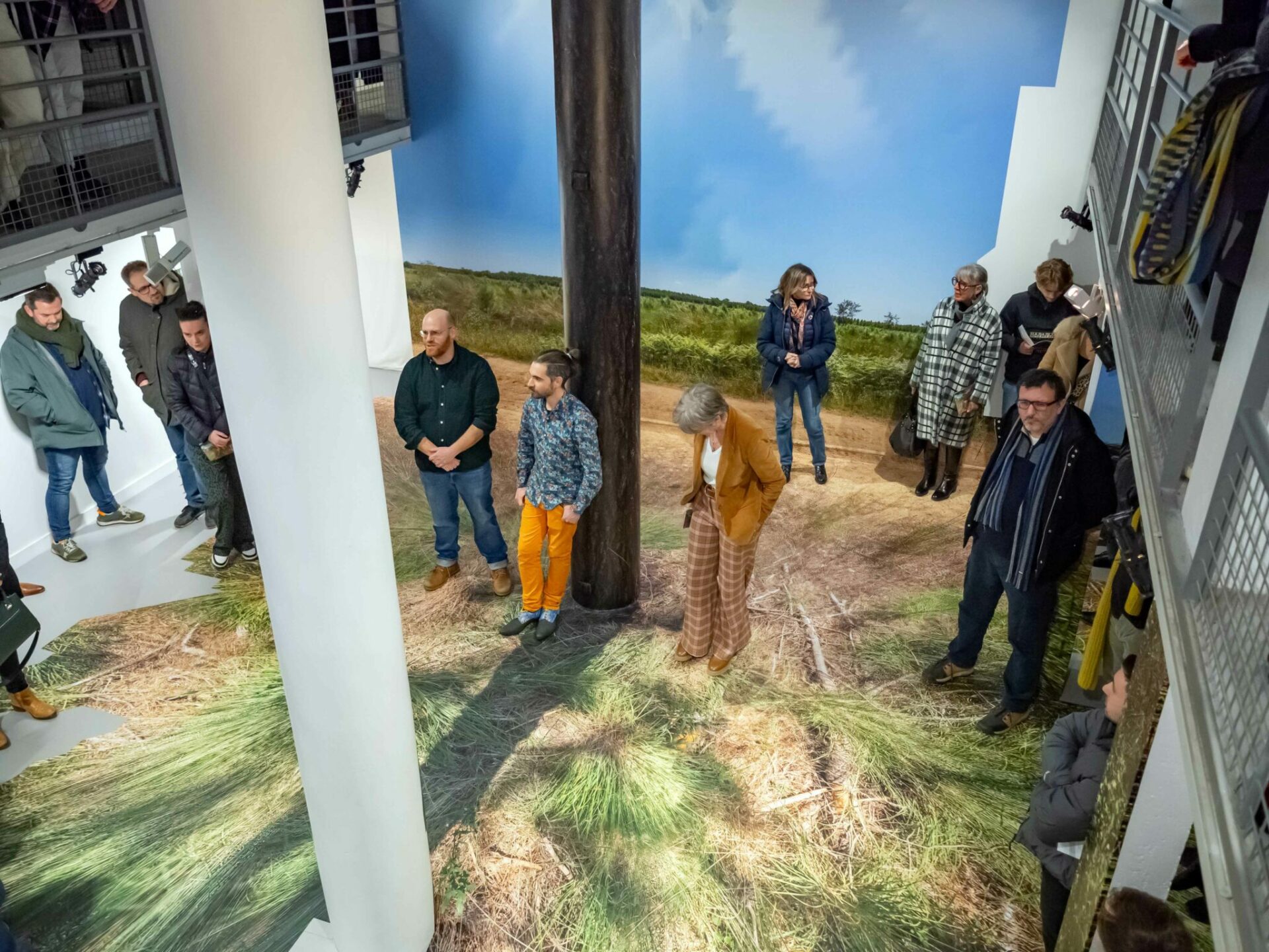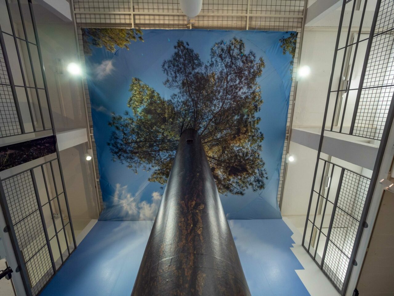 À la manière de Félix Arnaudin, les artistes ont arpenté ce secteur à la recherche des rares espaces horizontaux qui apparaissent de manière temporaire juste après la coupe rase d’une parcelle. Après une dizaine de jours, combinant marches et photographies, les artistes ont sélectionné un fragment d’espace qu’ils ont photographié sous toutes ses coutures. Les images ainsi obtenues ont été transposées et appliquées par projection à même les murs de la galerie, provoquant une intrication d’espaces discordants. Seul le pilier central s’ajuste parfaitement au tronc de l’arbre, faisant office de point de convergence. Ainsi, plus on s’en éloigne, plus l’image perd en définition, glissant au fur et à mesure du photoréalisme vers un rendu vaporeux tendant à une forme d’abstraction.