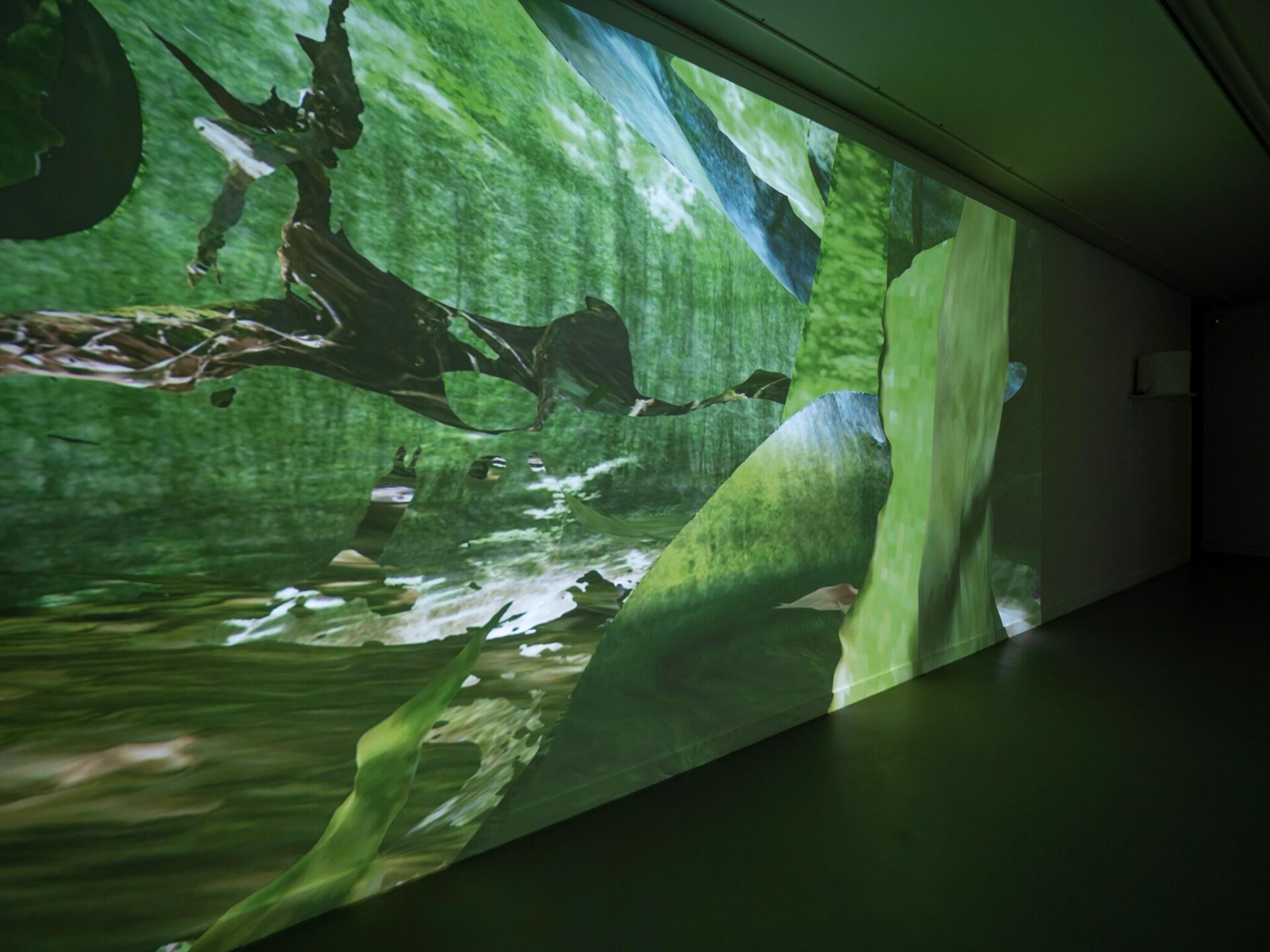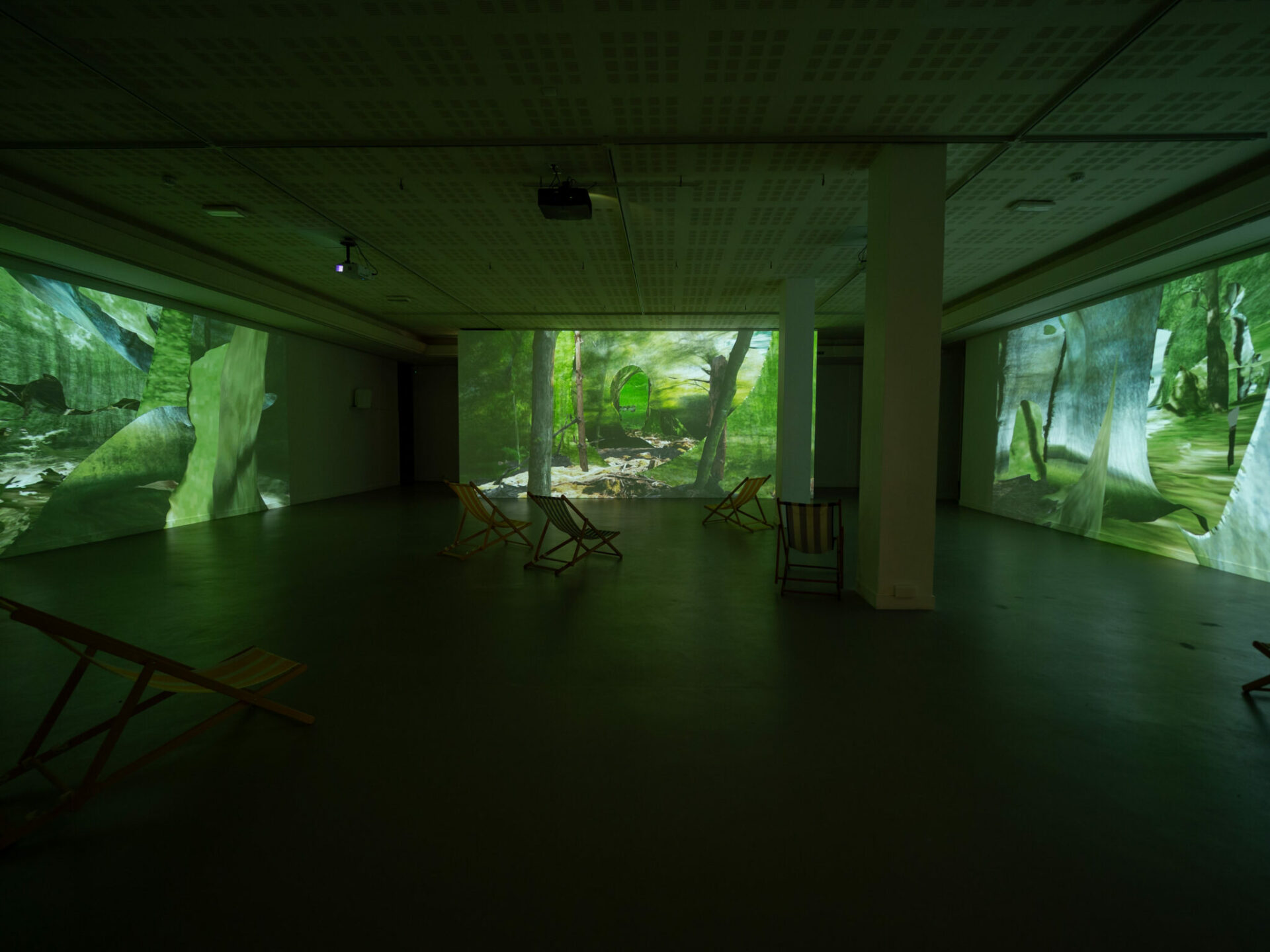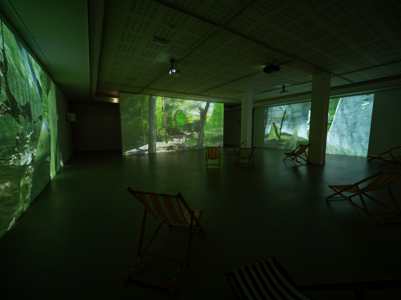 Cette installation propose une déambulation au cœur d’une forêt numérique issue d’une composition de photogrammétries* (scan 3D ou photographies 3D). Ce paysage figé se découvre lentement par le biais d’un mouvement de caméra uniforme et mécanique. Le voyage au sein de cet espace luxuriant forme une boucle parfaite, si bien qu’il n’existe ni début ni fin. Cette marche incessante peut s’apparenter à celle d’un promeneur perdu sous le couvert forestier. Comme un tableau inachevé, le spectateur découvre des espaces photoréalistes côtoyant des esquisses maladroites, pixelisées, aux couleurs baveuses, résultant d’interprétations erratiques des outils utilisés. Les visiteurs se retrouvent plongés au cœur de cette forêt artificielle, elle-même entrant en dialogue avec l’architecture du lieu. Elle réactive la présence de la nature dans cet espace clos et urbain. Pourtant, à bien y regarder, un certain trouble émane de ce paysage : la présence animale et les murmures du vent émergent seulement par le biais du son, témoin ténu d’une vie qui semble pourtant bien réelle. Ces échos viennent contredire l’aspect pétrifié de cette forêt, déclenchant ainsi un sentiment d’inquiétante étrangeté. Balançant entre l’hyperréalisme et l’abstraction pure, « Terrarium » est un territoire de contemplation mais aussi une interrogation sur la représentation et l’imitation du réel au travers des outils du numérique.