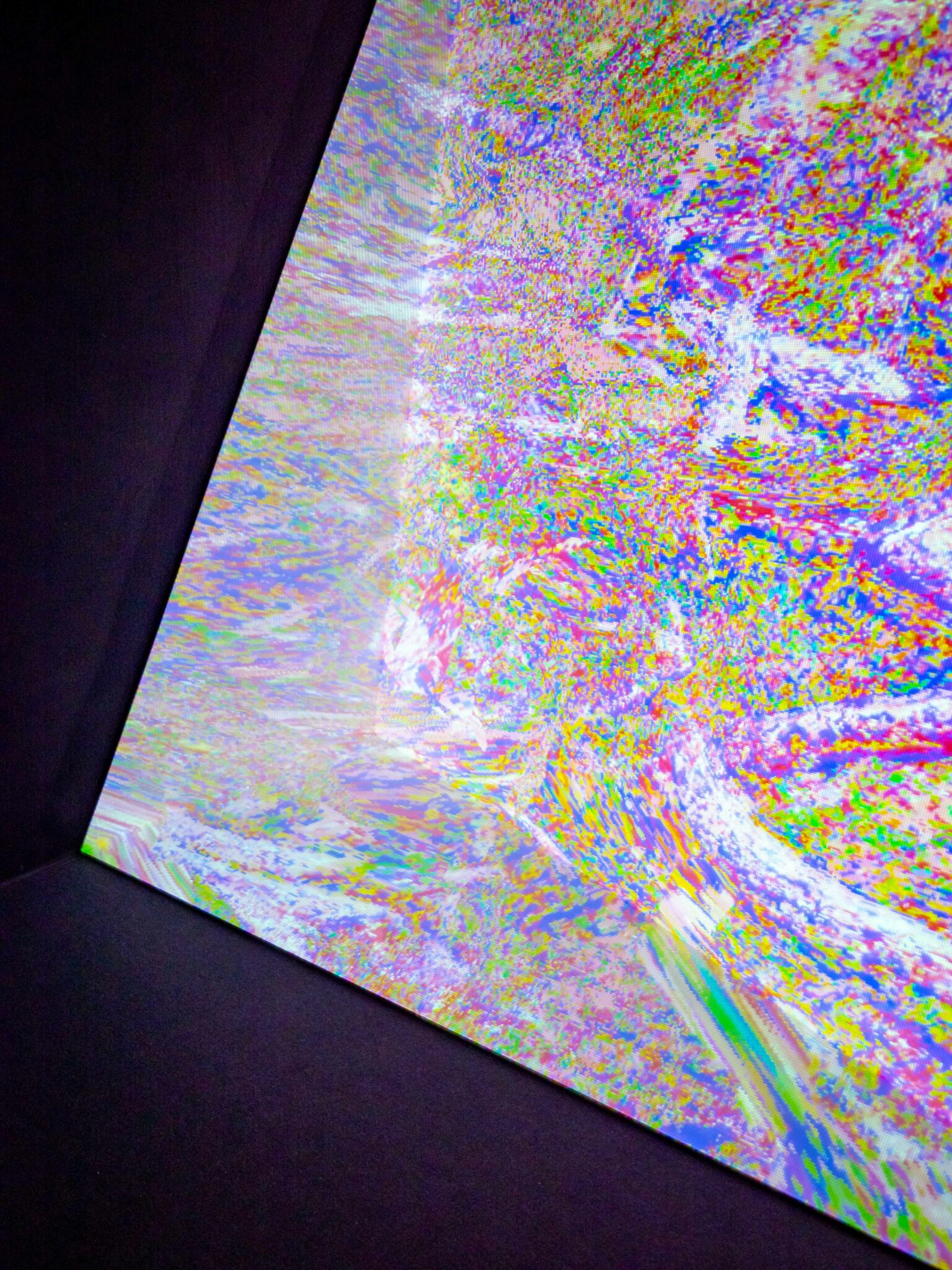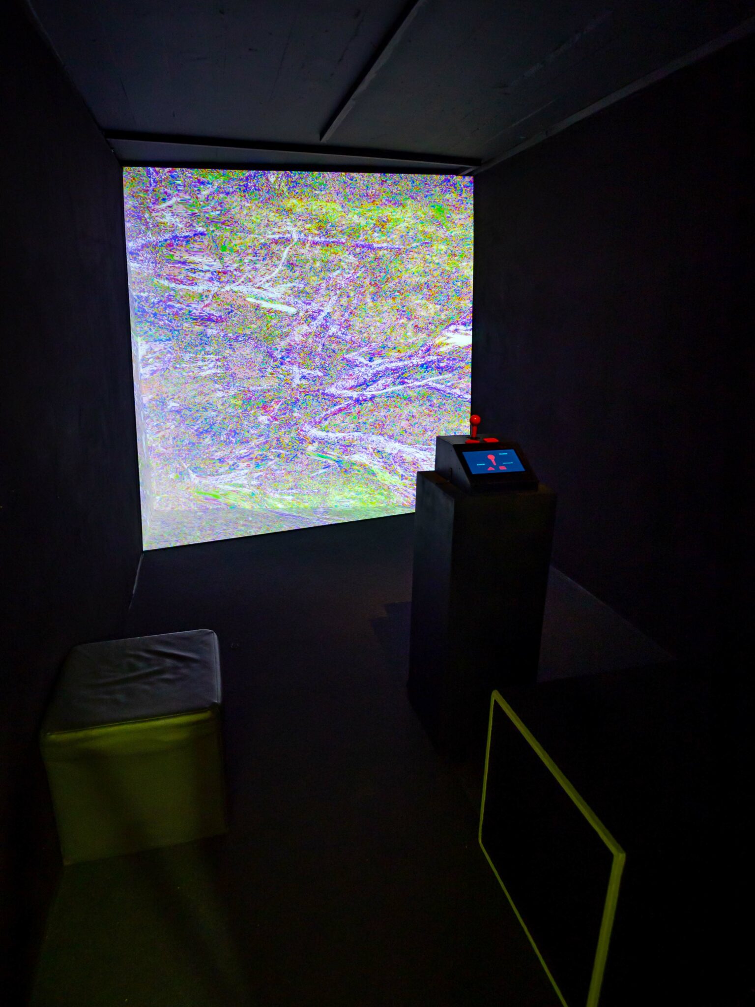 Cette installation propose de voyager à travers un univers buggé, où la perception de l’espace est inversée : les objets proches sont masqués par ceux situés au loin par un jeu de perspective renversée. Arrière-plan et premier plan sont ainsi intervertis tandis que les repères habituels (haut, bas, horizon, distances) deviennent flous. Au milieu de cet amas de pixels aux couleurs explosives, on distingue, au fil de l’exploration, une forme qui semble se dessiner : branches, ramifications, grotte, racines, des éléments fugaces qui peuvent évoquer un paysage naturel corrompu. Cet îlot quasi-informe est le seul élément visible au sein de cet univers. Le spectateur prend alors la place d’un explorateur, à la recherche d’une compréhension de ce monde. Il est impossible de réellement s’éloigner de cet espace replié sur lui-même : quelle que soit la direction choisie, même en avançant en ligne droite, on revient toujours au centre de ce microcosme. Lorsque l’on quitte le centre pour avancer dans l’inconnu, les parties de l’écran devenues vides sont remplacées par une surimpression issue des images précédentes, dessinant une trame persistante. Le numérique offre ici la possibilité de voyager et d’explorer un monde radicalement différent du nôtre, un espace impossible à la géométrie non euclidienne.