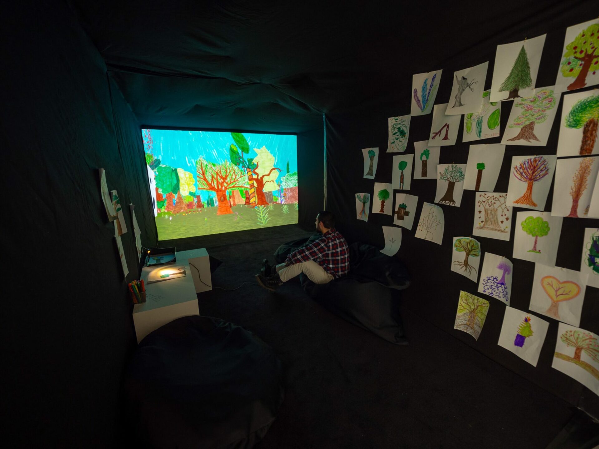 Cette création propose d’explorer une forêt virtuelle réalisée à partir de dessins d’enfants. Guillaume Lepoix a ainsi collecté, pendant 5 ans, des motifs de végétaux créés par plus de 600 écoliers, collégiens et lycéens, dans toute la France. Chaque arbre reflète ainsi la personnalité de son créateur, tout en se fondant dans l’ensemble complexe et protéiforme qu’est la forêt elle-même, composée par l’artiste. Avec près de 700 végétaux différents, cette forêt virtuelle bénéficie d’une biodiversité nettement supérieure à nos forêts européennes, interrogeant ainsi, notre rapport à la Nature et sa diversité à l’heure de l’anthropocène. Le spectateur/joueur est invité à explorer cette étrange jungle et à admirer les différents dessins réalisés. L’œuvre a l’allure d’un jeu vidéo sans vraiment en être un, du moins pas un jeu classique. Il n’y a ici aucun score à atteindre, aucun ennemi à abattre, ni énigme à résoudre et aucun but réellement explicité sinon celui de la libre déambulation, de l’exploration et de la contemplation.