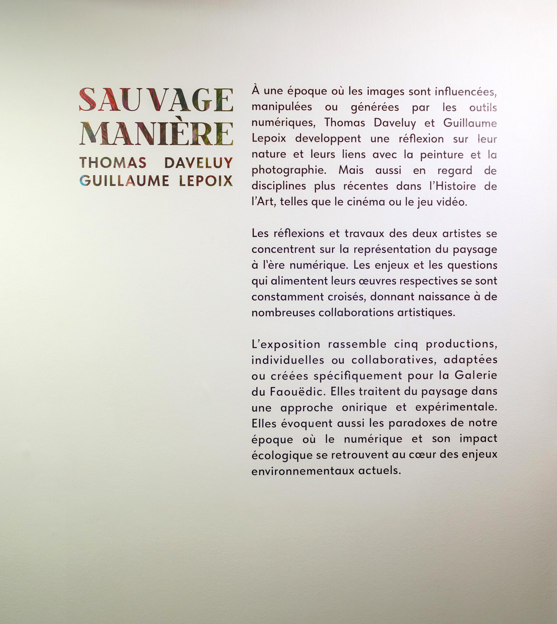 « Sauvage Manière » est le résultat d’une envie commune aux artistes Thomas Daveluy, Guillaume Lepoix et Anne-Marie Bressollier, responsable de la Galerie du Faouëdic jusqu’en 2023, d’ouvrir la Galerie du Faouëdic aux nouveaux médias. Le passage de relais à Delphine Balligand en 2023 a prolongé et renforcé la volonté de faire de ce lieu un espace d’expérimentations, où de nombreuses formes plastiques peuvent s’exprimer et proposer une vision originale et singulière. Les réflexions artistiques de Thomas Daveluy et Guillaume Lepoix s’axent autour du paysage et de sa représentation à l’heure du numérique. Les enjeux et les problématiques qui nourrissent leurs travaux respectifs n’ont eu de cesse de se croiser, donnant lieu à de nombreuses collaborations artistiques ces dernières années.